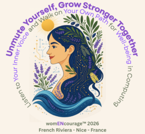 The womENcourage™️ 2026 logo visually embodies this year’s theme, “Unmute Yourself, Grow Stronger Together: Well-being and Support for Women in Computing.” The design weaves together elements of nature, technology and regional identity to reflect a unified, holistic and peaceful vision of humanity in harmony with the whole, particularly the nature and all that it creates and surrounds us, by focusing on the Yin qualities of the Feminine (the representation of the feminine) and the Yang qualities of the Masculine (information technology)